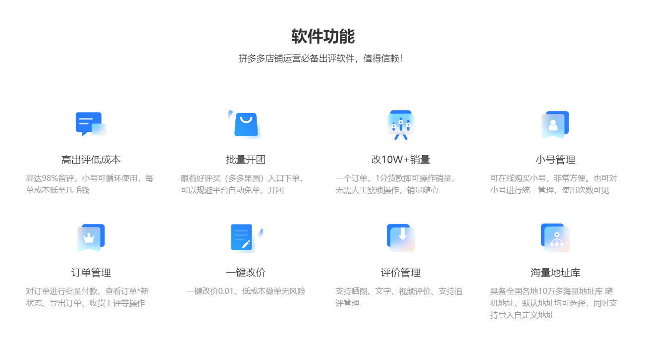 多多出评软件是一款能自动开团拼团、支持批发、关键词搜索、多多进宝、拼内购、万人团、一托多单、果园等等。批发高出评,搜索开团,拼内购提升店铺权重 坑产 店铺层级 畅销榜等等。